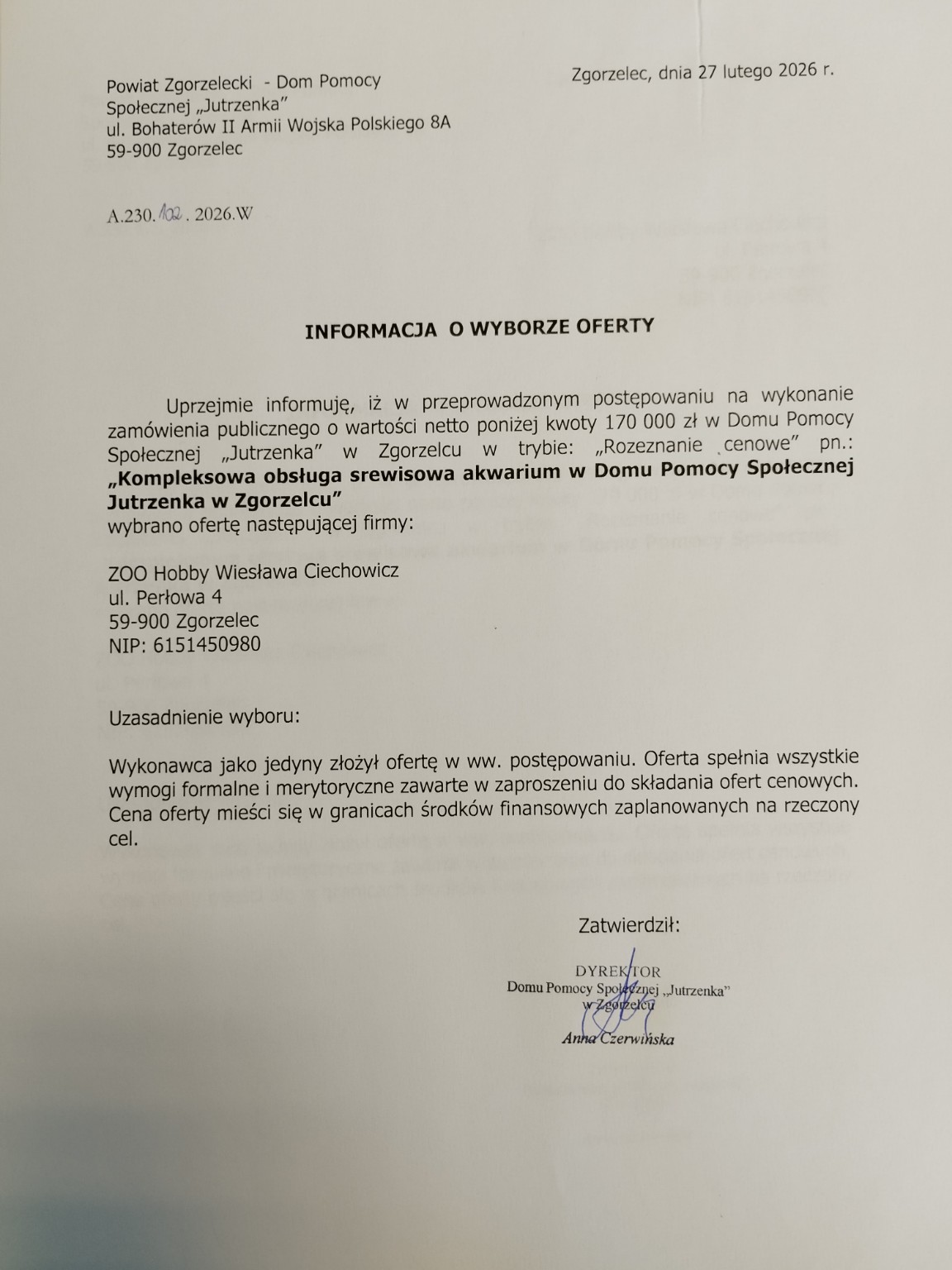 Informacja o wyborze oferty na wykonanie zamówienia o wartości netto poniżej kwoty 170 000zł na zadanie :” Kompleksowa obsługa akwarium w Domu Pomocy Społecznej “Jutrzenka”